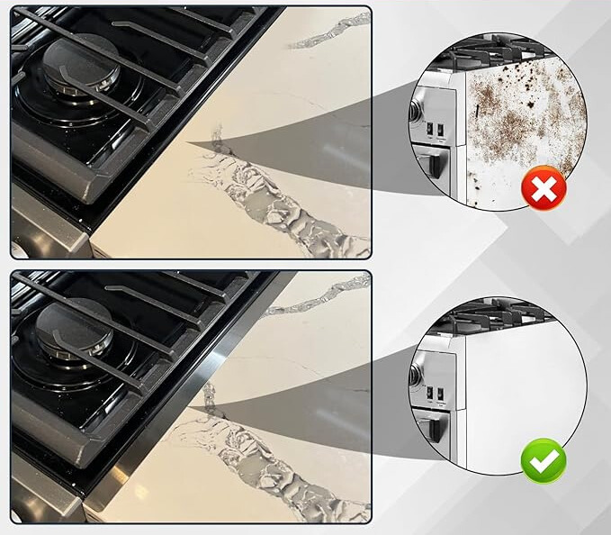 🔥 Heat Resistant 🍽️ Fills Gaps Between Stove & Counter 🧼 Easy to Clean 🔩 No Tools Required 💧 Spill-Proof Design 💰 Acceptable Price 👌 Sleek & Seamless Fit